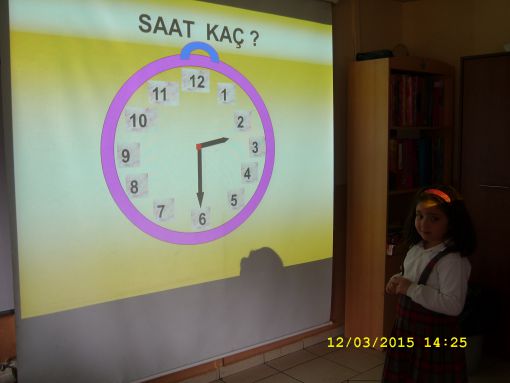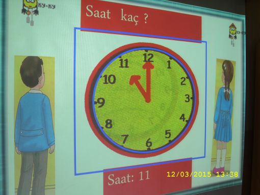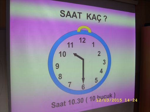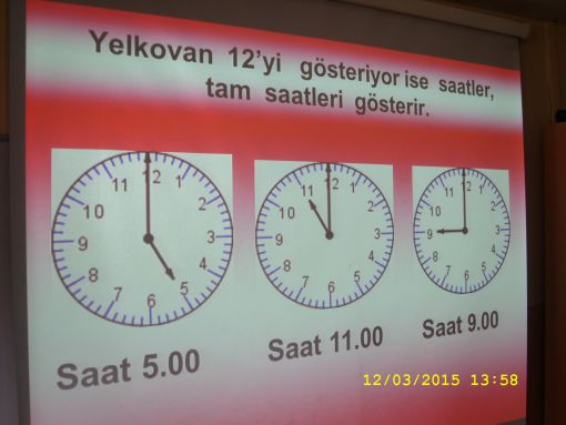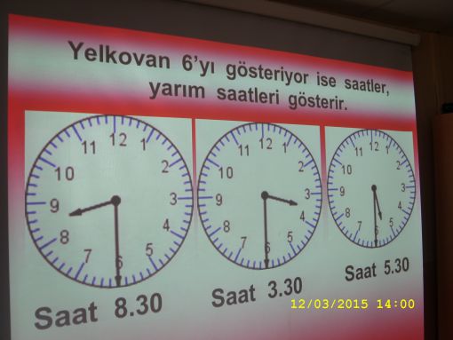 ÖNCE TAHTAYA ÇİZDİĞİMİZ MODEL SAAT ÜZERİNDE, SONRA DA İKİ AYRI SUNUMDA YANSI ÜZERİNDE ÖĞRENDİK, TAM VE YARIM SAATLERİ.