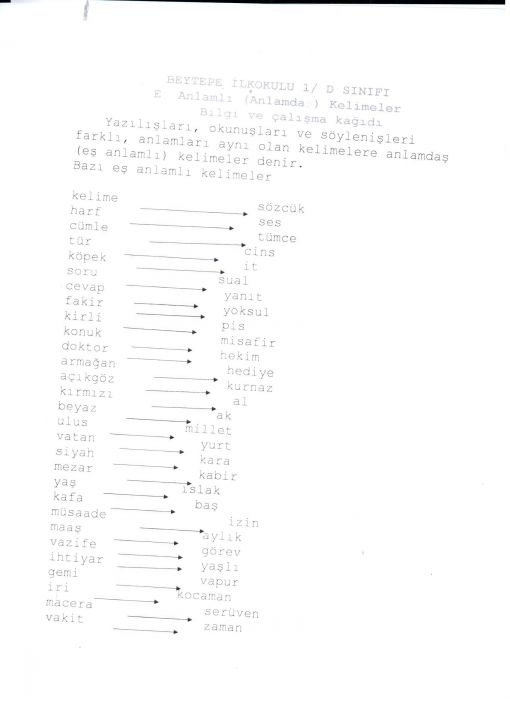 EŞ ANLAMLI KELİMELERİN ÖĞRENİLMESİNE YÖNELİK OLARAK HAZIRLANAN BU BİLGİ NOTU, ÖNEMLİ BELGELER DOSYASINDA MUHAFAZA EDİLECEKTİR.