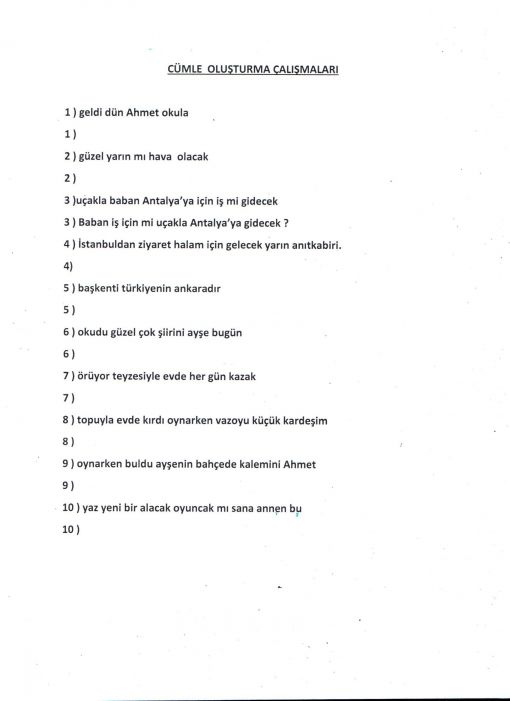 Karışık ve kuralsız olarak yazılan sözcüklerden anlamlı ve yazım kurallarına uyuarak cümle oluşturulması beklenmektedir.