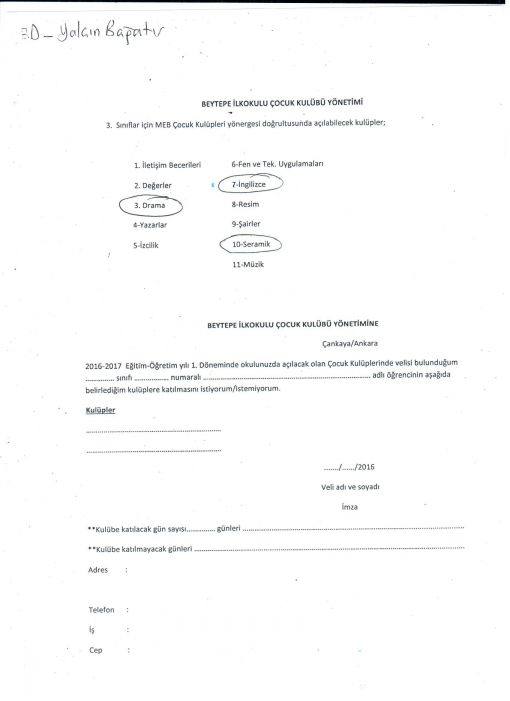 DERS ETÜTLERİNE İLİŞKİN AÇIKLAMALAR VE FORM. ![]() Bunlardan ilki etüt belgesinde görüleceği üzere " dramadır " Bu ders benim böyle bir dersi verebilecek potansiyelim olduğu için, bu yönde bir artı sertifikaya sahip olduğum için tasarlanmıştır. İkinci kısım ise gerçekten seçim gerektirmektedir. Bilindiği üzere sınıf öğretmeni olarak ben 4 ( dört ) iş günü çocuklarla birlikte olabiliyorum. Beşinci gün ise belirlenen branş öğretmeni derse girmektedir. Geçtiğimiz zaman dilimlerinde hatırlanacağı üzere resin- drama gibi dersleri ekstra almış, bu derslere dışarıdan hocalar girmişlerdi. Bu kez de öyle olacak. Bizim için belirlenmiş iki ders bulunmaktadır. Siteden de paylaştığım üzere seçimlik dersler arasından bizim için Seramik ve İngilizce drsleri belirlenmiştir. Tarafınızdan belirlenecek olan bu iki derse katılım sağlayacak çocuklarım. Sınıfın tamamı bir dersi seçebileceiği gibi sınıf tercihler doğrultusunda ikiye de bölünebilir. Seçimlik dersler arasında sunulan ingilizce benim toplantıda duyurduğum ingilizce dersleri dışındadır. Onunla ilgisi yoktur. Bir başka deyişle bu da ekstra bir çalışma olacaktır. Seçimlik dersler arsından sadece bu dersler tarafınızdan seçilebilir. Solda tafarta bulunan ve sitede yayınladığım örnekte de görüleceği üzere " Drama " , sağ taraftaki derslerden de tercihiniz doğrultusunda ya seramik ya da İngilizce seçilmelidir. Her ikisi de değil bunlaradan sadece bir tanesi seçilecektir. Soldaki drama da zorunlu olarak işaretlenecektir. Bilginize... ![]() |