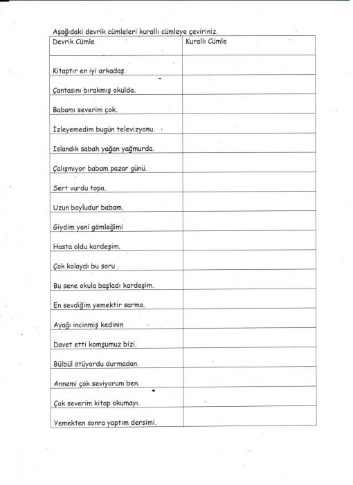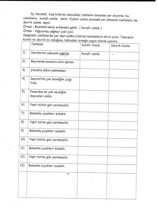 Bugün gördüğümüz konunun pekiştireci olması için ev etkinliğimizi aynı konudan verdik. ( Kurallı ve devrik cümle )