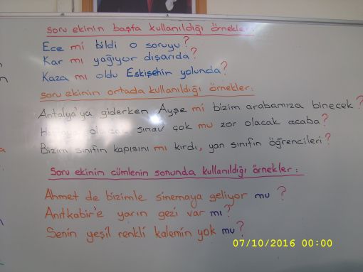 SINIF ÇALIŞMALARIMIZ... ![]() Sonuç ne oldu diye merak edenler için hemen vereyim sonuç bilgisini... Daha ilk ders bitmeden, " Aynı Tas Aynı Hamam." Matematik dersimiz kapsamında ise örüntü konusuna yeniden merhaba dedik. Özellikle de sayısal örüntülere. Sayısal örüntülerdeki kuralların ne olduğunu nasıl anlayacağımızı gördük, bir kez daha. Günün akademik anlamdaki en başarılı işi Türkçe dersimiz kapsamında yapıldı. Dün tekrarlarına başladığımız, " Yazım Kuralları " üst başlığı altında bugün kü konumuz " Soru Ekleri " idi. Cümlelerimizde " mı -mi - mu -mü " soru eklerinin nasıl yazılması gerektiğini gördük yeniden. Kurallarını yazdık önce tahtamıza. çocuklarım da defterlerine aldılar yazılanları. Bir sonraki adımda da örnekler verdik bu kullanımlara ait. Bu eklerin cümlenin başında, ortasında ve sonunda kullanımlarını gösterdik. Her türlü durumda deyişmen tek şeyin ise soru işaretinin mutlaka cümlenin sonunda kullanılması gerektiği idi. Bir başka deyişle; " SORU İŞARETİ SORU EKİNDEN SONRA DEĞİL, SORU CÜMLESİNİN BİTİMİNDEN SONRA KULLANILIR " kaydının belleklerinde yer etmesi idi. ![]() ![]() ![]() |