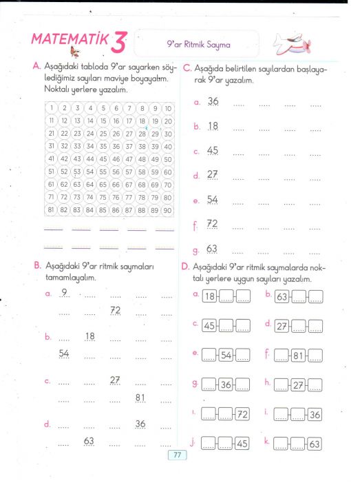 Bir tanesi dokuzların çarpımına aittir. Bir diğeri bugün tekrarını yptığımız çıkarma işleminde verilmeyeni bulma konusundan.