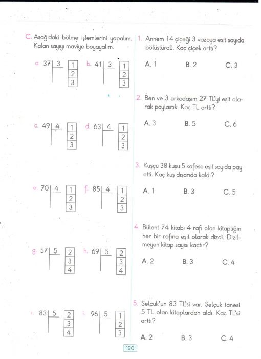 Önce bölme işlemini takrarladık. Nereden başlayacağımızı anımsattık, örnekler verdik. Ardından kalanlı bölmeye geçtik. Nasıl yapılacağını anlattık. Kalan kısmının nasıl gösterileceğini anlattık. Son olarak da kalan sayıyı bir kademe ilerletmeyi öğrendik.