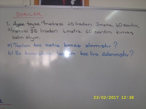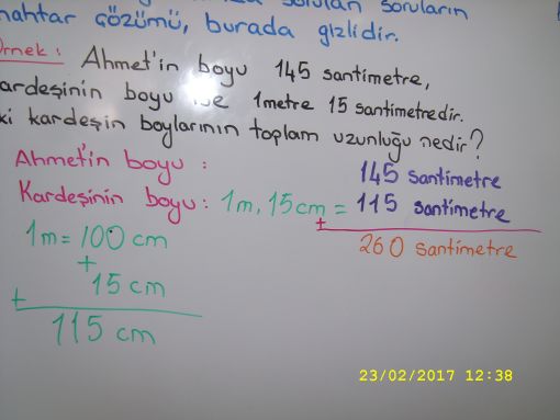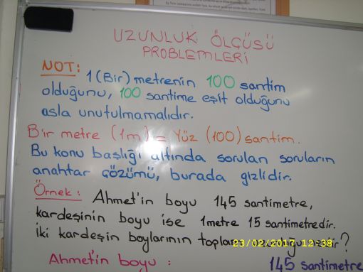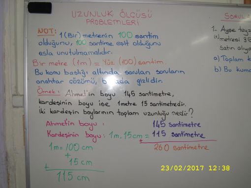 SINIF ÇALIŞMALARIMIZ... ![]() Yarın da bu konu üzerinde çalışacağız, çalışmaya devam edeceiz. Bir sonraki adımımız ise matematik idi. Matematikten uzunluk ölçülerine devam edildi. Yazı tahtamızda ayrıntılı notlar yer aldı ve örnekler çözdük. ![]() ![]() ![]() ![]() |