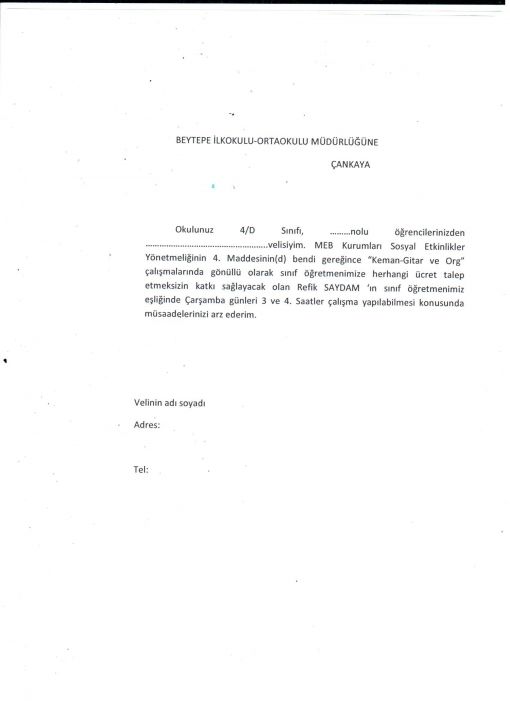 BİLGİLENDİRME YAZISI... ![]() Okul yönetimi bu yıl hiç bir şekilde ücretli bir çalışmayı uygun görmemektedir ve de bununla ilgili onay vermemekyedir. Bu yazı ile okul yönetimi ben bu bahsi geçen kursun ücretsiz yapıldığını, çalıştırıcının hiç bir şekilde ücret istemeyeceğini teminat altına almak istemektedir ve de bu konuda da son derece haklıdır. Bizim ne yaptığımız direkt olarak yönetimi ilgilendirmemekle birlikte bir sorun yaşanması durumunda bu belgelerle bu işin ücretsiz yapıldığı bilgisinin kendisine ulaştırıldığını belgeleyecektir. Bu formun onaylanıp hemen yarın geri yollanması gerekmektedir. ![]() |
