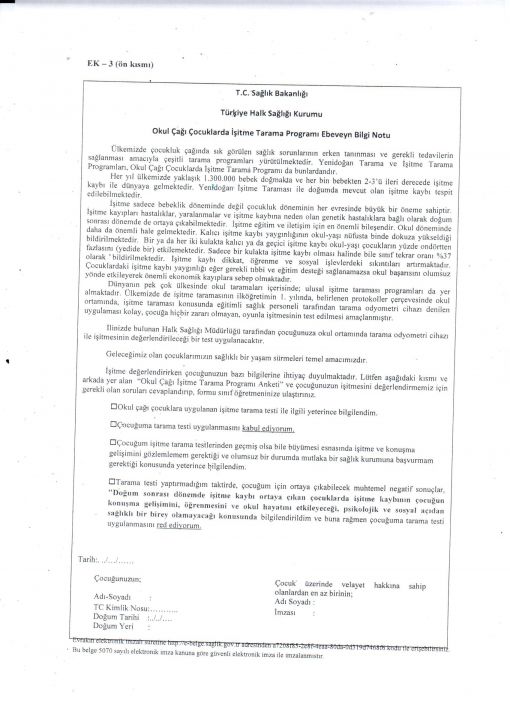 Okulumuzda yapılacak olan işitme taraması için gereken onayı kapsayan bir form tarafınıza çocuklarım aracılığıyla yollanmıştır.