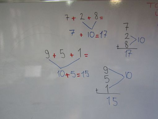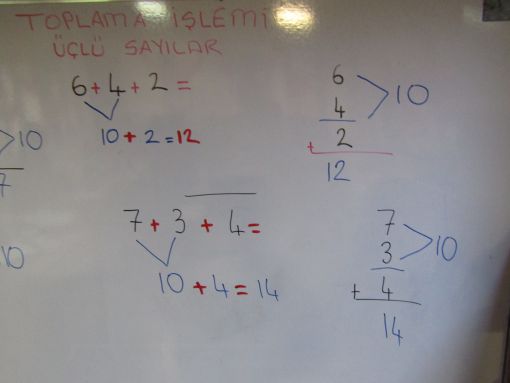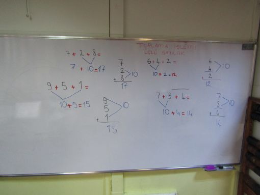 Üç sayıdan oluşan toplama işlemini anlattık, nasıl yapılacağını gösterdik ve sınıfta iki ayrı çalışma kağıdı üzerinden uygulama yaptık.