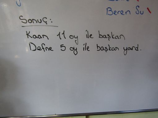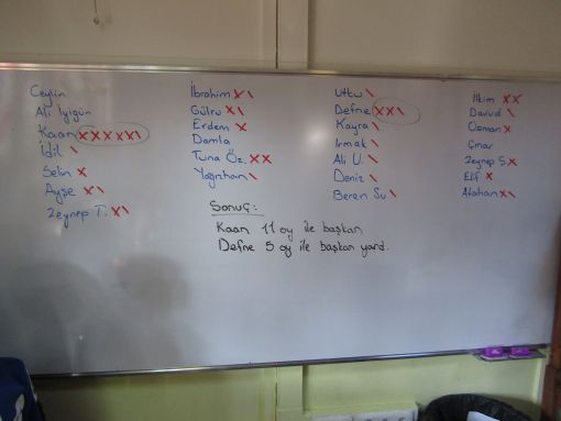 Çok sayıda başkan adayımız vardı. Her oy pusulasına her öğrenci iki sism yazabildi. Oy kullanma tamamlandıktan sonra teker açıldı pusulalar ve yazı tahtasına isimlerinin karşısına aldıkları her oy işlendi.