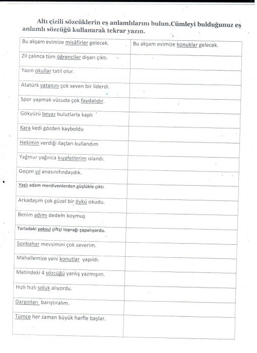 Ev etkinliğimiz... ![]() Yazılacak olan şiirimiz, dünkü sayfanın bir sonrasında. Bu kez bir parça daha az. İkinci ödevimiz ise biraz daha kapsamlı. Gün içerisinde öğrenilen " Eş anlamlı ( anlamdaş ) kelimeler ile ilgili. Kağıtta verilen altı çizili sözcüklerin eş anlamlısını bulup cümle içerisinde bir kez de o hali ile onlar kullanacak. Ellerinde eş anlamlı sözcüklerin bazılarına ilişkin bir liste bulunmakta. ![]() |