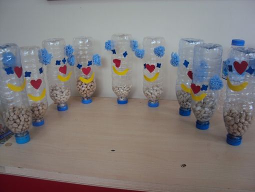 0.5 LİTRELİK, BOŞ KÜÇÜK SU ŞİŞESİNİN İÇERİSİNE KOYULMUŞ BİR AVUÇ KURU BAKLİYAT İLE BASİT MARAKAS OLUŞTURULABİLİR.
