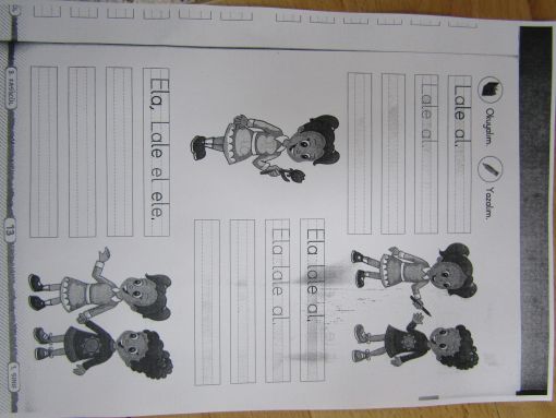 EV ETKİNLİKLERİ HAKKINDA... ![]() İkincisi de dünkü çalışmanın bir benzeri olarak deftere yazım şeklinde olacak: Yazı defterlerimize, Beş sıra " Lale, lale elle. " Beş sıra, " Ela, lale al. " Beş sıra, " Ela, Lale el el ele. " yazılacak ve de okunacak. ![]() |