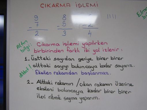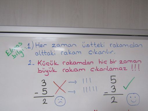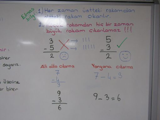GÜNÜN ÇALIŞMALARI... ![]() Konunun devamında sıra oraya gelecek zira. Günün ikinci kısmında ise yine matematik ve çıkarma işlemi vardı. Çıkarma işleminin püf noktalarını anlattık. Tahtaya küçük notlar yazdık. Altın bilgiler ile konunun önemli kısımlarını vurguladık. İki basamaklı sayıdan tek basamaklı bir rakamın çıkarılmasına kadar geldik ve onu da gösterdik. Çıkarma işleminin en ince noktalarının öğrenilmesine çalıştık. Altın bilgiler, bu işin can damarıdır. ![]() ![]() ![]() ![]() ![]() ![]() ![]() ![]() ![]() ![]() ![]() |