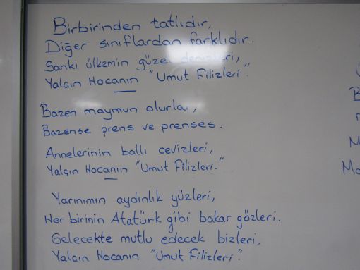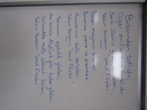 GÜNÜN ÇALIŞMALARI... ![]() Her bir çocuğuma okutma şamnsı bulduk. Sorularımızı yanıtladık. Hayat bilgisi dersimiz kapsamında iki aşamalı bir çalışma yürüttük. Birinci kısımda kitabımızda yer alan 151. sayfadaki İstiklal marşımız üzerinde yeniden konuştuk. hemen altında ve arka sayfasında yer alan kısımları kitap üzerinde doldurduk. Bununla ilgili tahtamıza bilgi notları yazdık. İstiklal Marşımızın önce iki kıtasını okuduk, sonra benim tarafımdan 10 kıtası seslendirildi. Matematik dersimizde ise yine çıkarma işlemi üzerinde durduk. Yarın da bunun üzerine yeni eklemeler yapmaya devam edeceğiz. 18 Mart Çanakkale Zaferine ilişkin bir de boyama yaptık. Bir de süprize imza attık. Sabah okuduğumuz şiirden sonra biz de sınıfta doğaçlama bir şiir yazdık. ![]() ![]() ![]() ![]() ![]() ![]() ![]() |