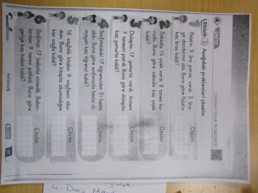 Toplama ve çıkarma işlemi problemlerine ilişkin üç adet fotokopi verdim.